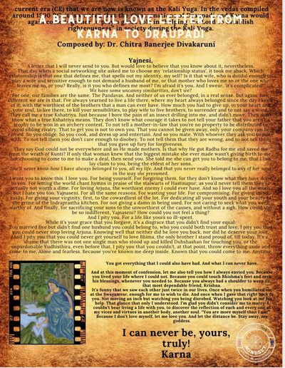 I want you to know this. I love you. For being yourself. For forgiving them, for they don’t know what they have done to you. For letting the world chant hymns in praise of the stalwarts of Hastinapur, as you’d never tell them they’re actually not worth a dime. For loving Arjuna, the worthiest enemy I could ever have. And so I love you all the more.