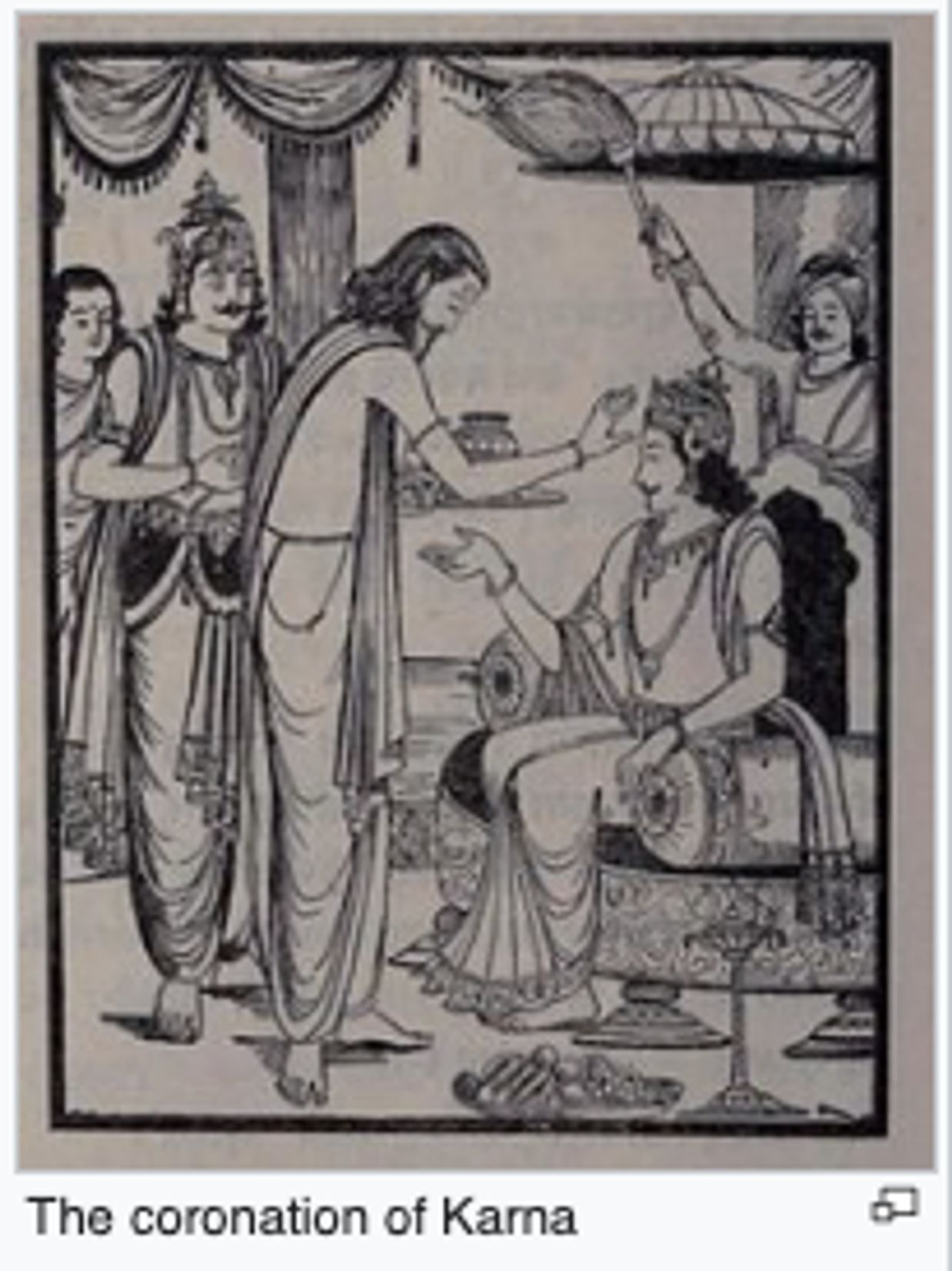 Once Karna is a king, states Duryodhana, Arjuna would not have the excuse to avoid Karna and not compete with the able warrior. Karna accepts the anointment, becomes a king that day. It also transforms him into a loyal friend to Duryodhana, with an eagerness to reciprocate the favor. Karna asks Duryodhana what he would want in return for the kingdom he just gave out of his empire, Duryodhana replies, "I want your endless friendship Karna".  Image courtesy of Wikipedia