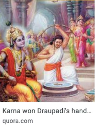 KarNa won Draupadi’s hand in marriage even before Arjuna by hitting the fish’s eye with an arrow, but again was rejected. At Draupadi’s Swayamwar (men completing various tasks to outshine another to win the “Draped” as a wife), KarNa shoots the fish before Arjuna. However, he is publicly humiliated by Draupadi as she rejects him outright and proclaims in front of the whole crowd that she would never marry a Suta (someone of a low caste/social station). KarNa accepted this and walked away.KarNa was cursed by a priest for accidentally killing a cow while practicing archery. He helped a small child and was cursed by Mother Earth due to his very bad luck at the time. Mother Earth cursed KarNa that when he would be at his most vulnerable, his mother would abandon him.