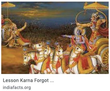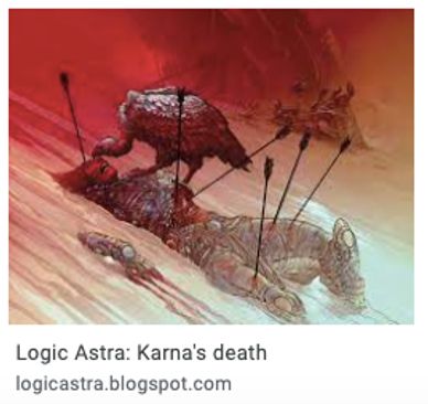 And even when KarNa was laying on the ground knocking on death’s door, still he chose to give. When KarNa was dying in the mud, Krishna came forth in the disguise of a priest and asked for some alms from KarNa. KarNa took a stone from the ground and broke one of his gold teeth and gave it to the brahmin. Instead of thanking KarNa for his sacrifice, the brahmin/priest cursed KarNa for giving him teeth with saliva on it. KarNa, almost dead, took a bow and arrow and punctured earth so that there was a spring of water to wash the teeth clean. He offered the clean gold teeth to Krishna.